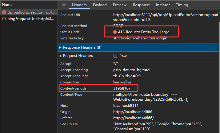 在使用UEditor编辑器上传视频时由于视频文件太大导致上传失败,报错误码:Status Code:413 Request Entity Too Large,见下图: