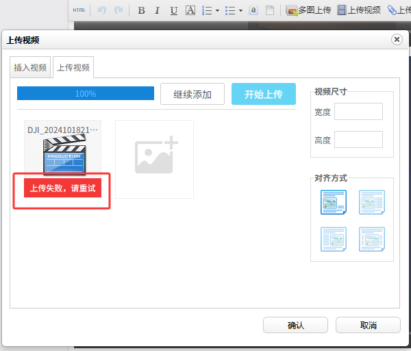 在使用UEditor编辑器上传视频时由于视频文件太大导致上传失败,报错误码:Status Code:413 Request Entity Too Large,见下图: