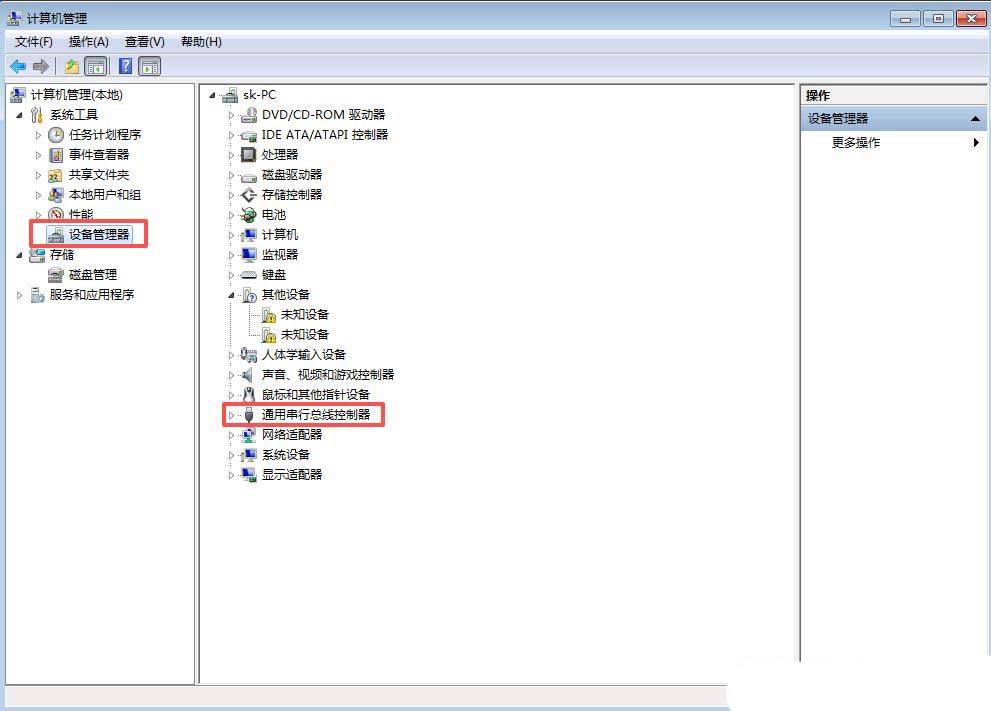 2、然后左侧点击【设备管理器】设备管理器窗口中,点击展开【通用串行总线控制器】;