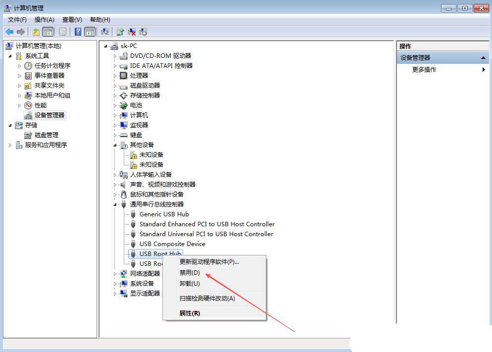 3、然后,右键点击其中任意一个“USB Root Hub”,选择“禁用”该设备。