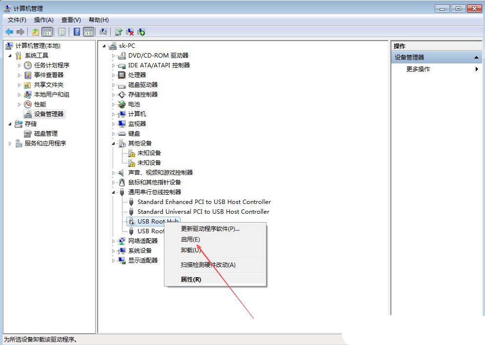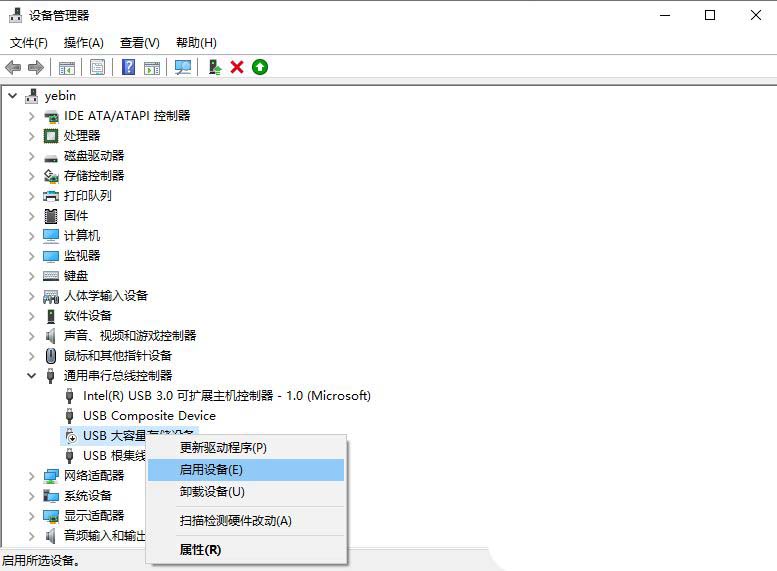 5、最后,再右键点击此设备,选择“启用”,重新插入USB设备即可;