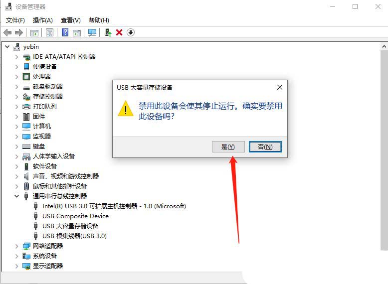 4、弹出提示框中,点击【是】,再【右键】点击该设备,在打开的菜单项中,选择【启用设备】,最后重新插入USB设备即可;